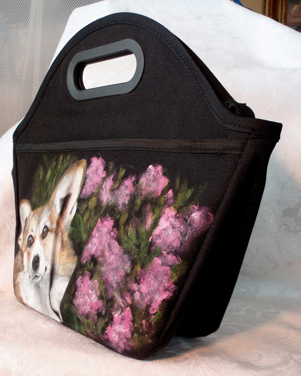 Hand painted portrait of 'Tony' a Corgi on a PackiT freezable Traveler Lunch Bag