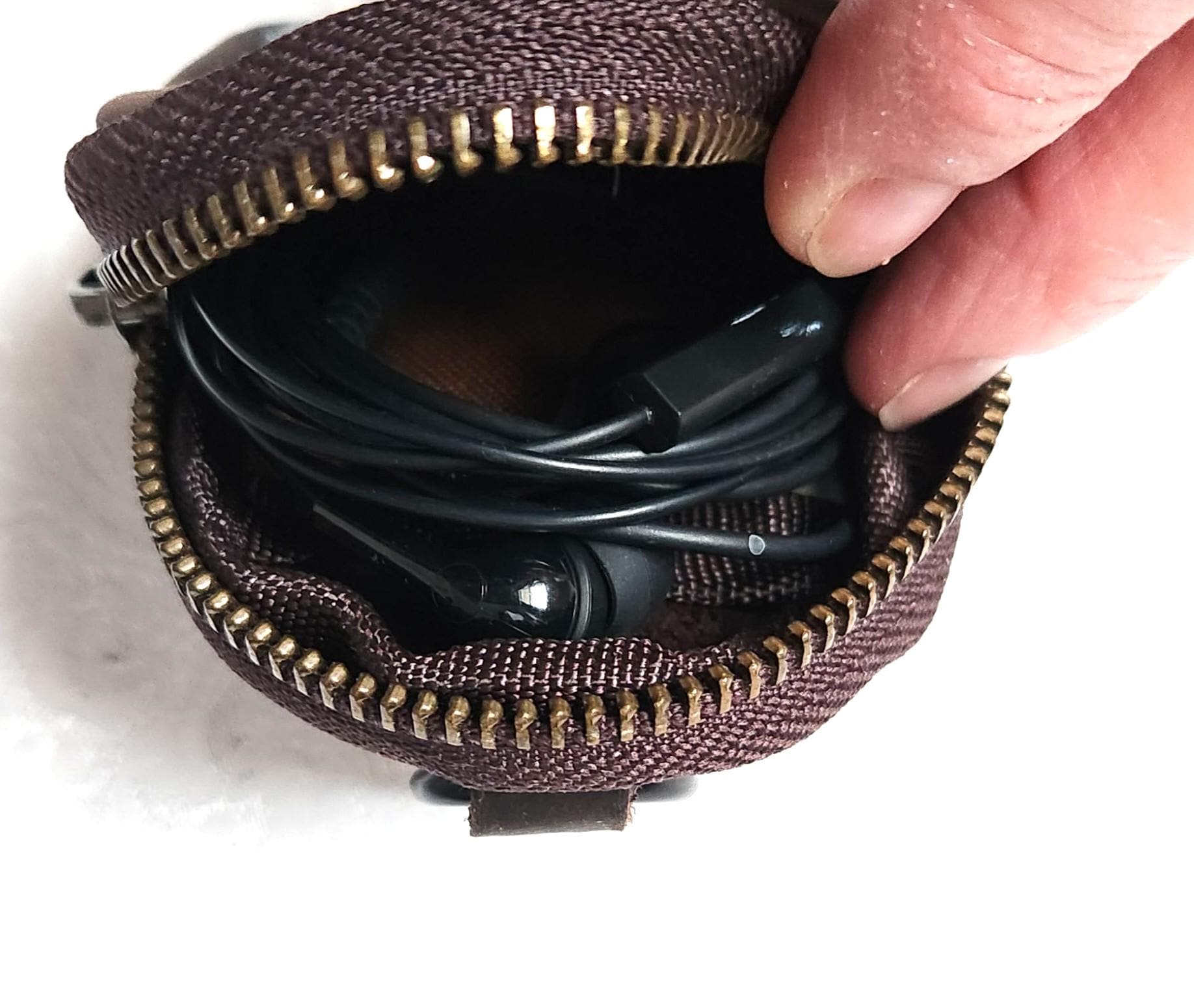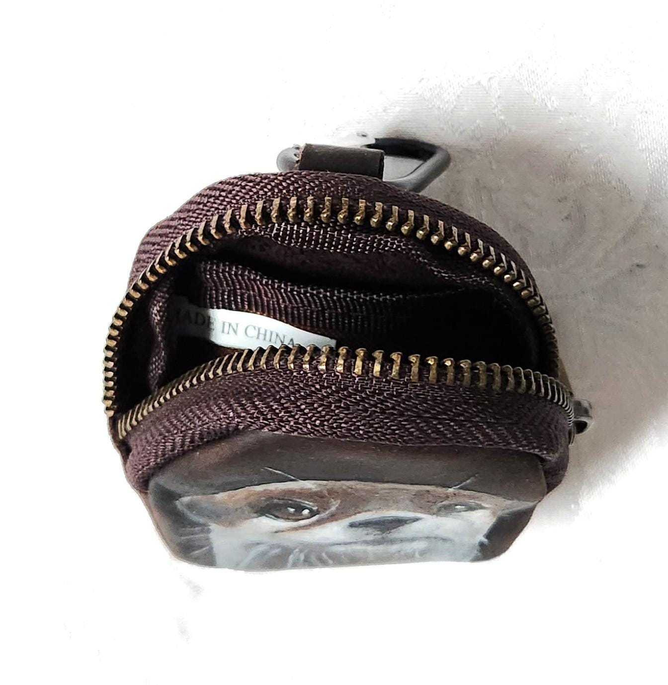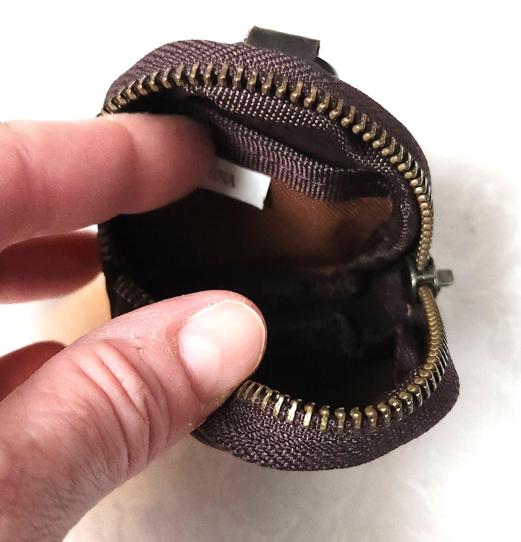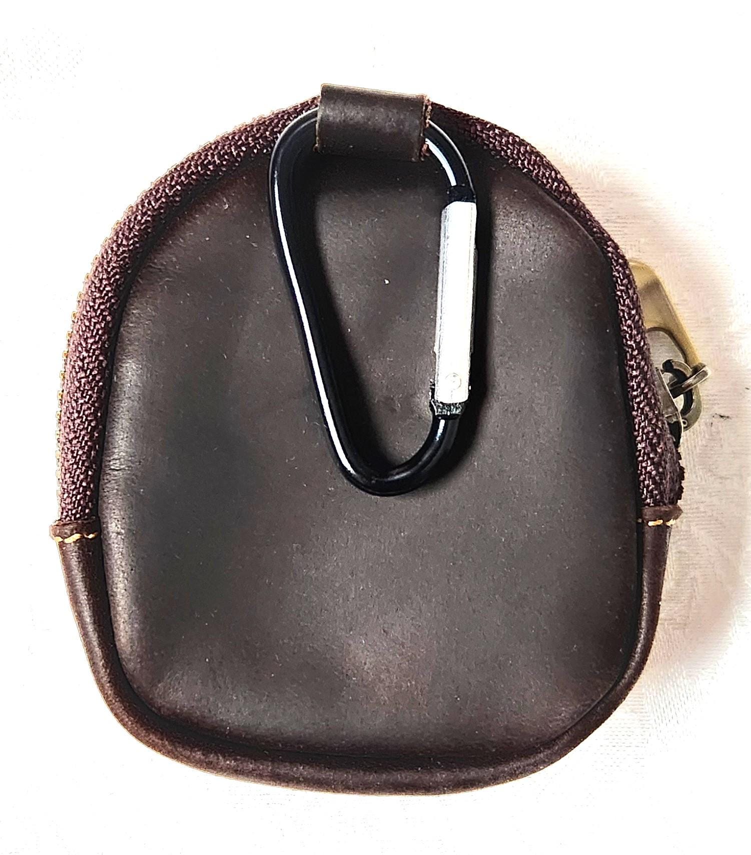 This leather mini pouch is perfect for so many things. It's made of leather, has a zip closure, a small slip pocket inside and a carabiner for hanging. You can clip it on a purse, suitcase or on a belt loop.