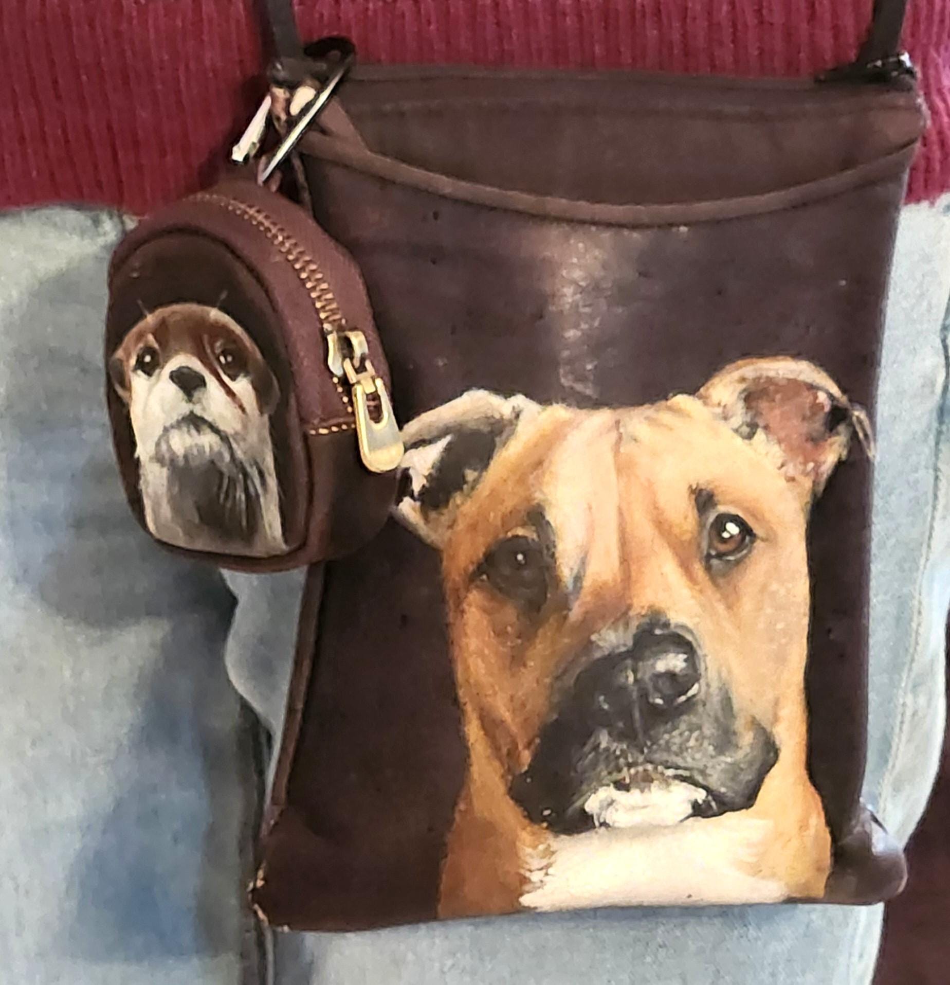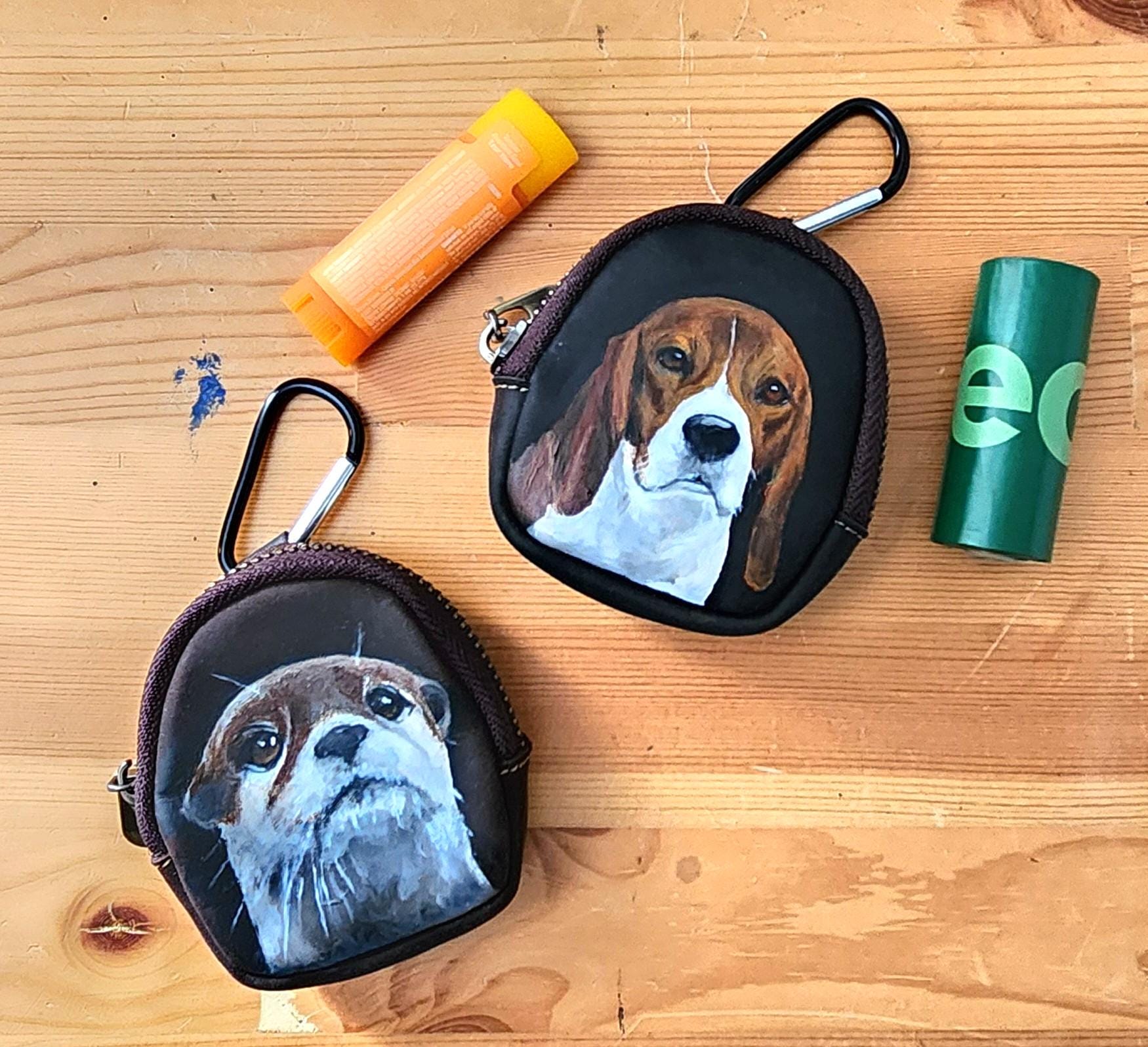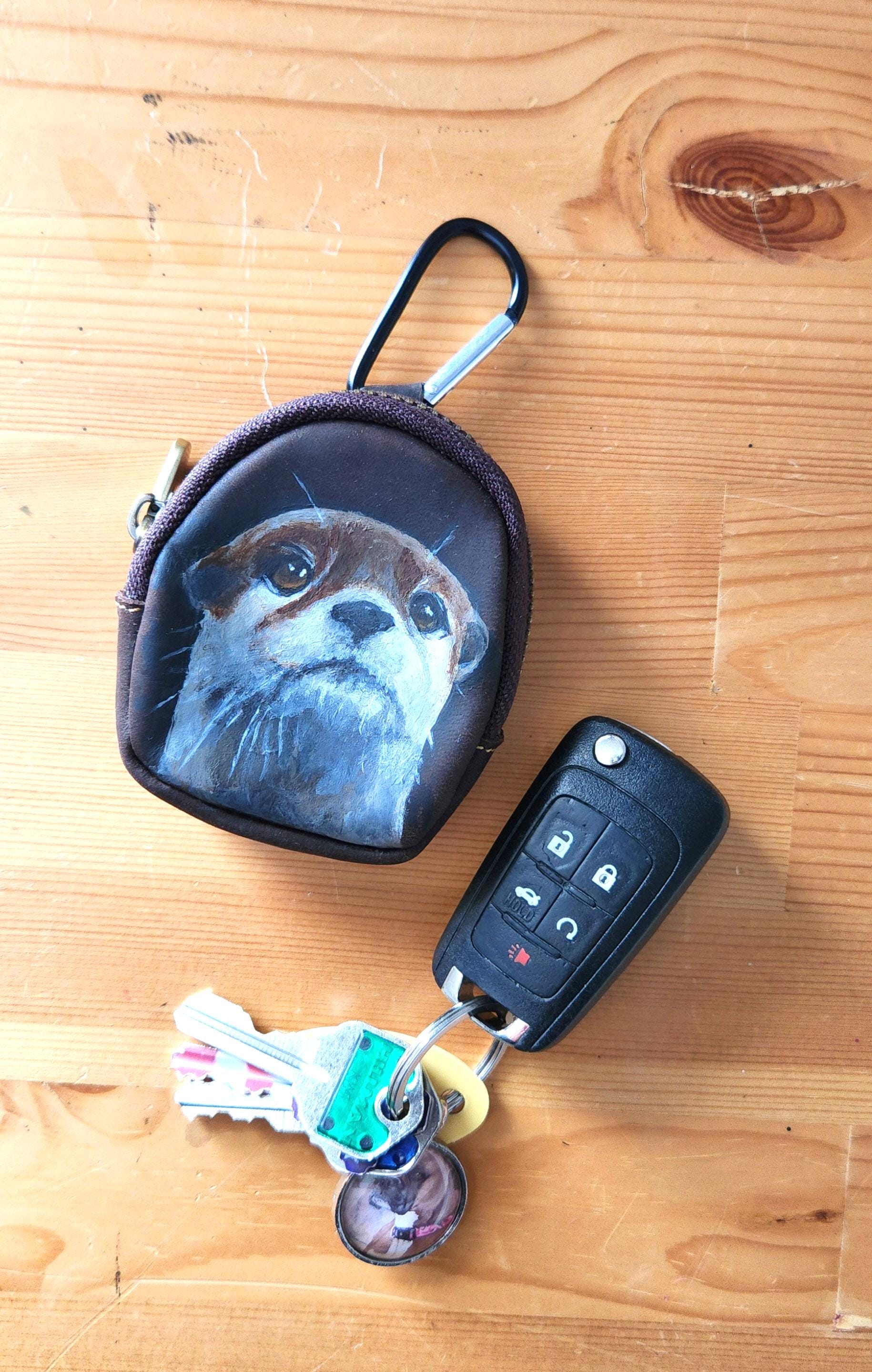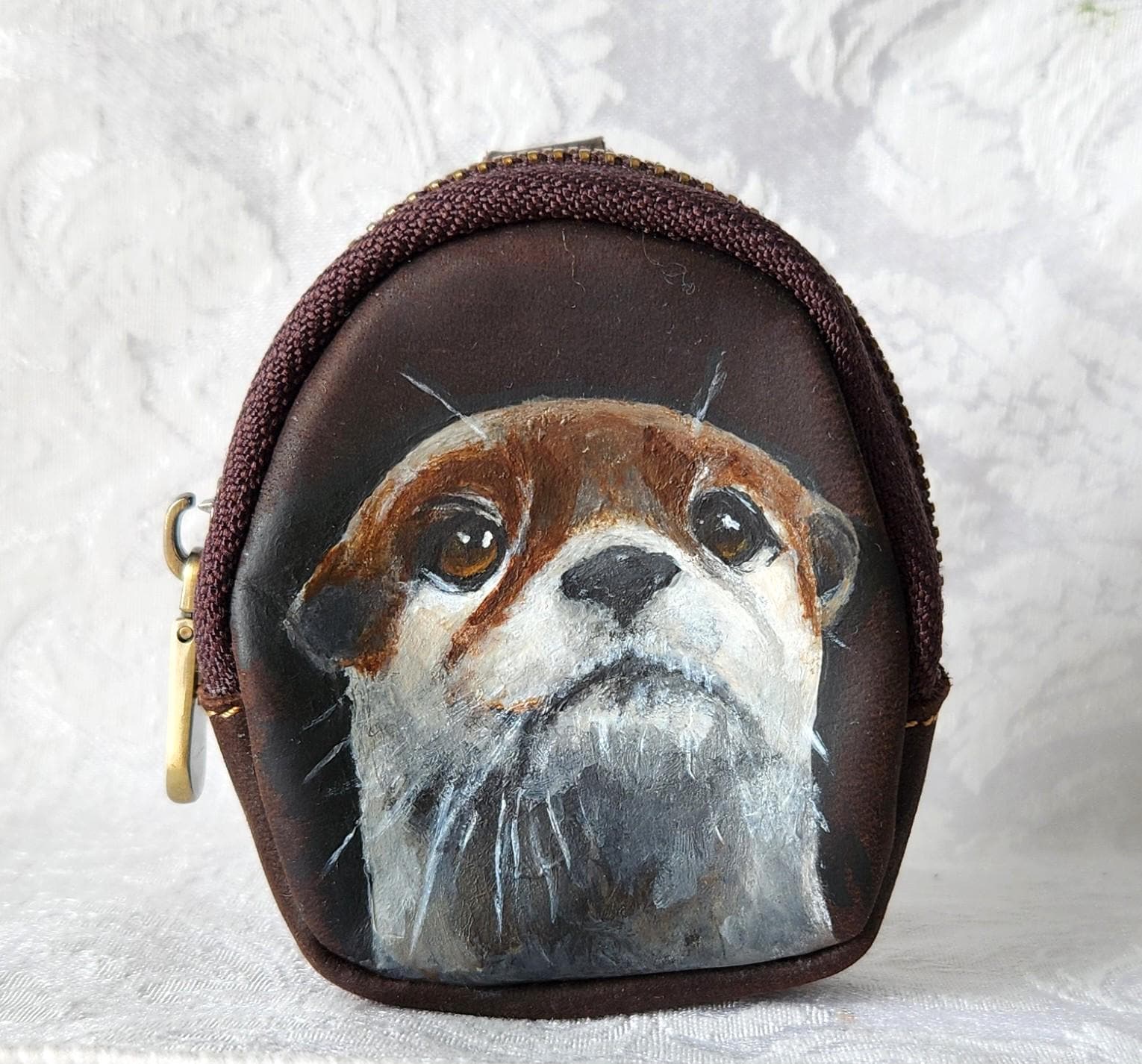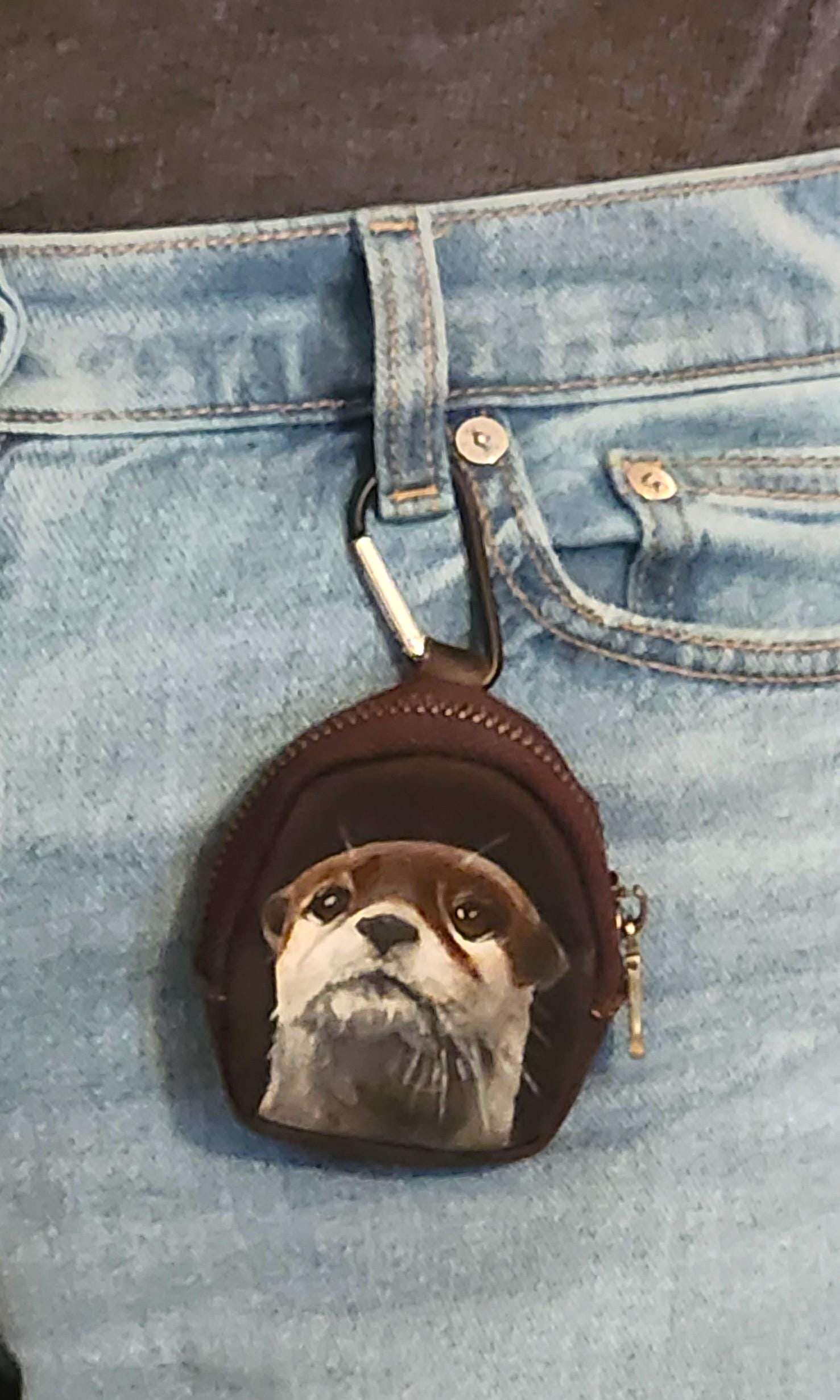 I've painted Oliver on this pouch. He's painted with leather acrylics and protected with several applications of topcoat for protection.