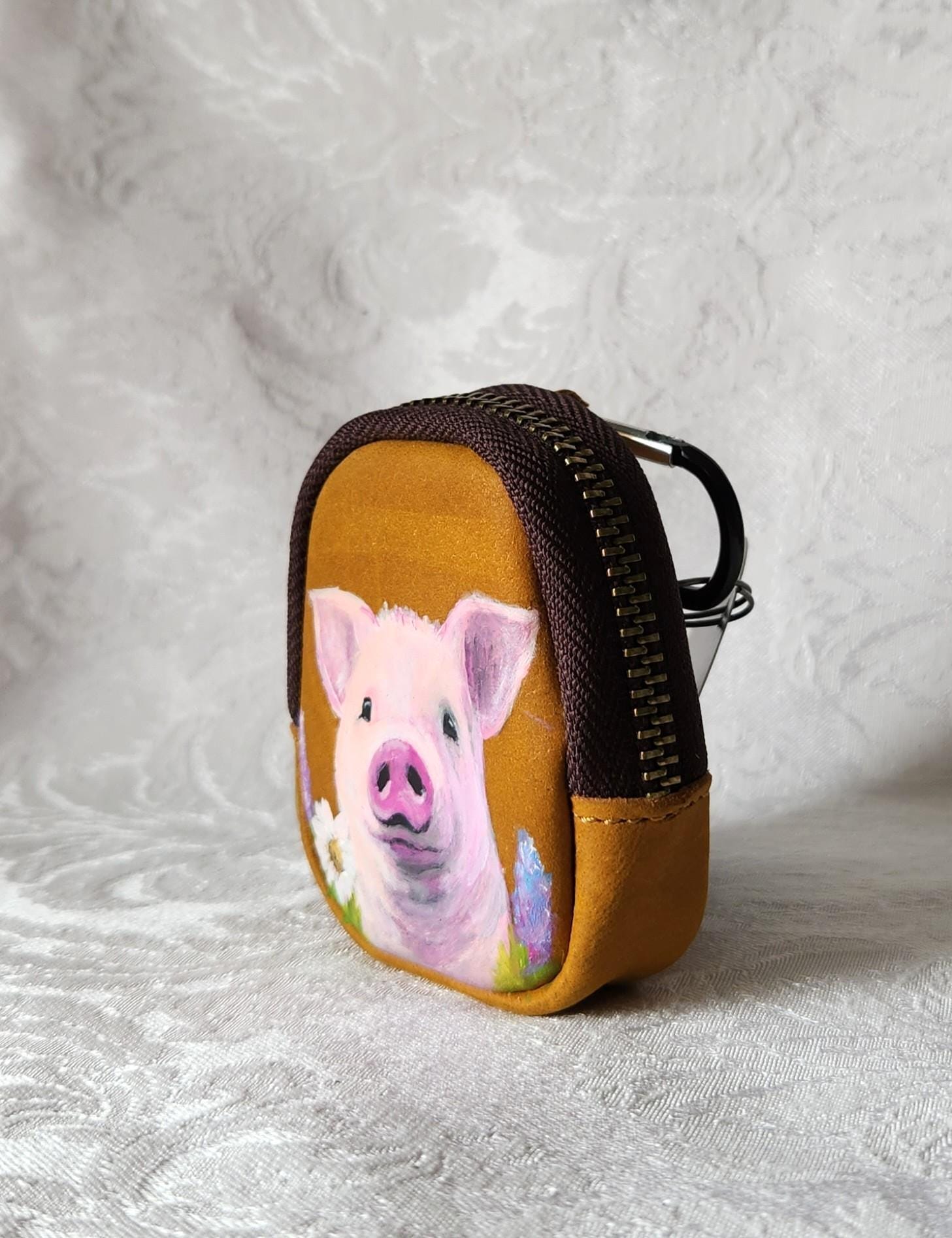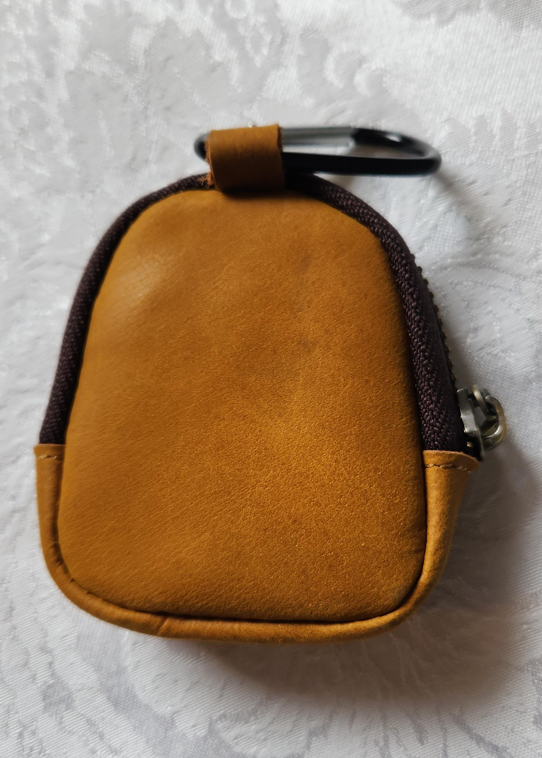 This leather mini pouch is perfect for so many things. It's made of leather, has a zip closure, a small slip pocket inside and a carabiner for hanging. You can clip it on a purse, suitcase or on a belt loop.