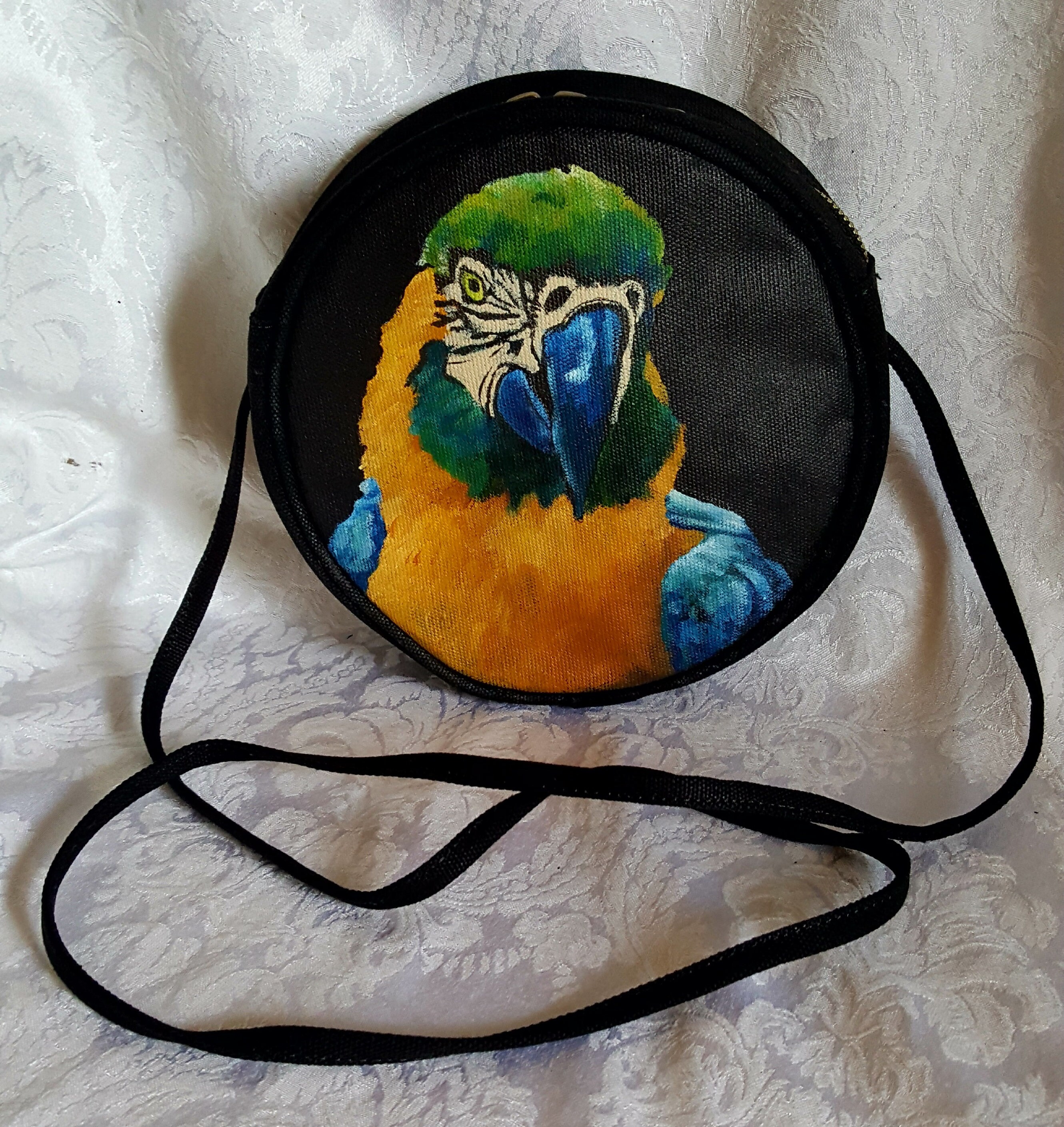 This round crossbody purse is perfect for day trips, festivals, concerts and travel. The interior is one large area with a slip pocket on the side. The shoulder strap is adjustable, just tie it and knot it inside the main compartment. A handy slip pocket can be found on the exterior of the purse, perfect for your phone.