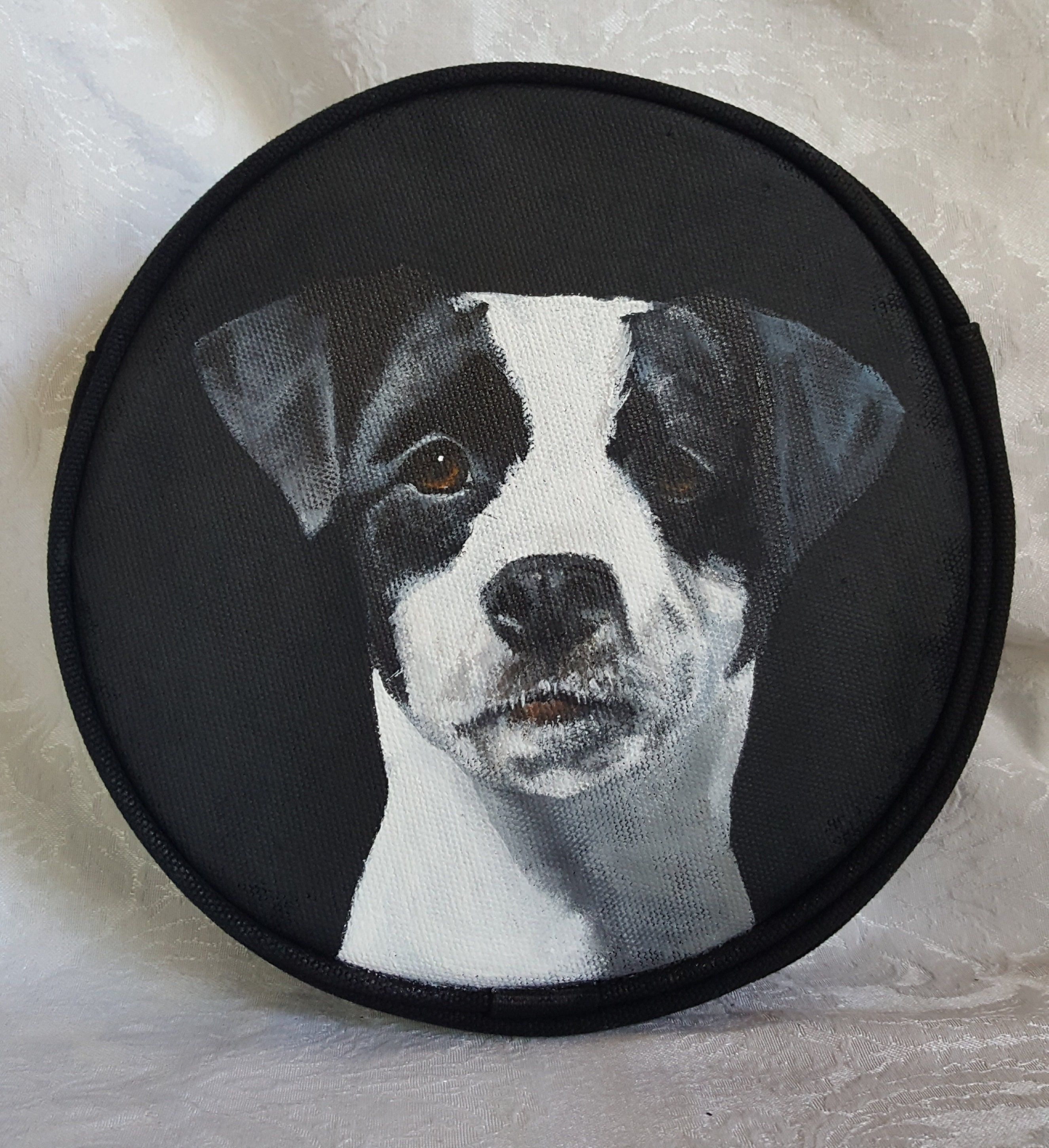 Your pet will be painted with fabric acrylics and heat set.